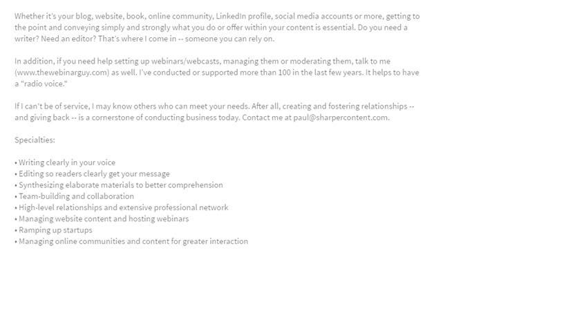 What makes this summary great is the fact that Mr. Lazen talks about his business accomplishments and provides a glimpse into his witty personality with “I’m the calm one” or “I don’t care who gets the credit, I just want to win”. People who go to his profile can see what he offers and he ends with a nice call to action.